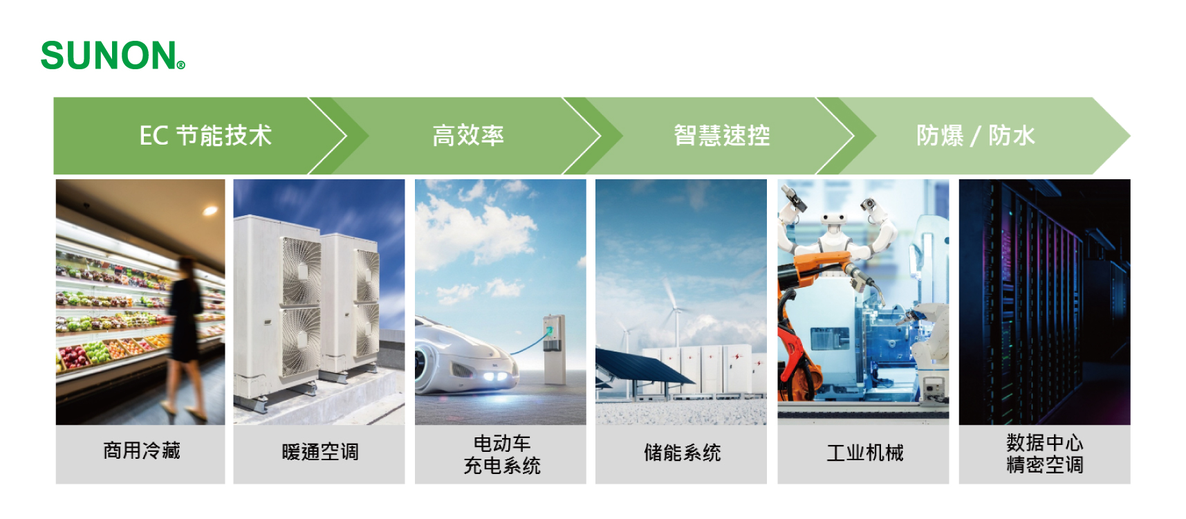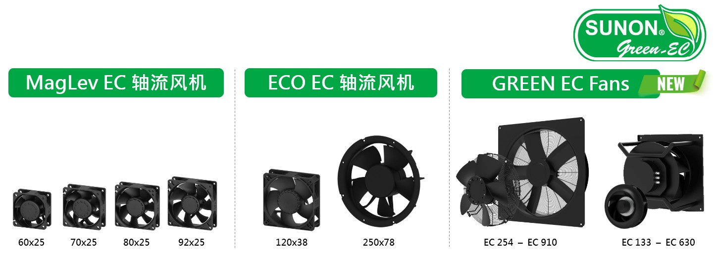 SUNON高效节能EC风扇将DC风扇直流马达及转速控制功能,直接应用于交流电源输入环境,并拥有节能与智慧控制等优势,SUNON高效节能EC风扇依据不同产业应用共分为三大系列,小型的MagLev EC、Eco EC 系列,与大型的Green EC 系列。
