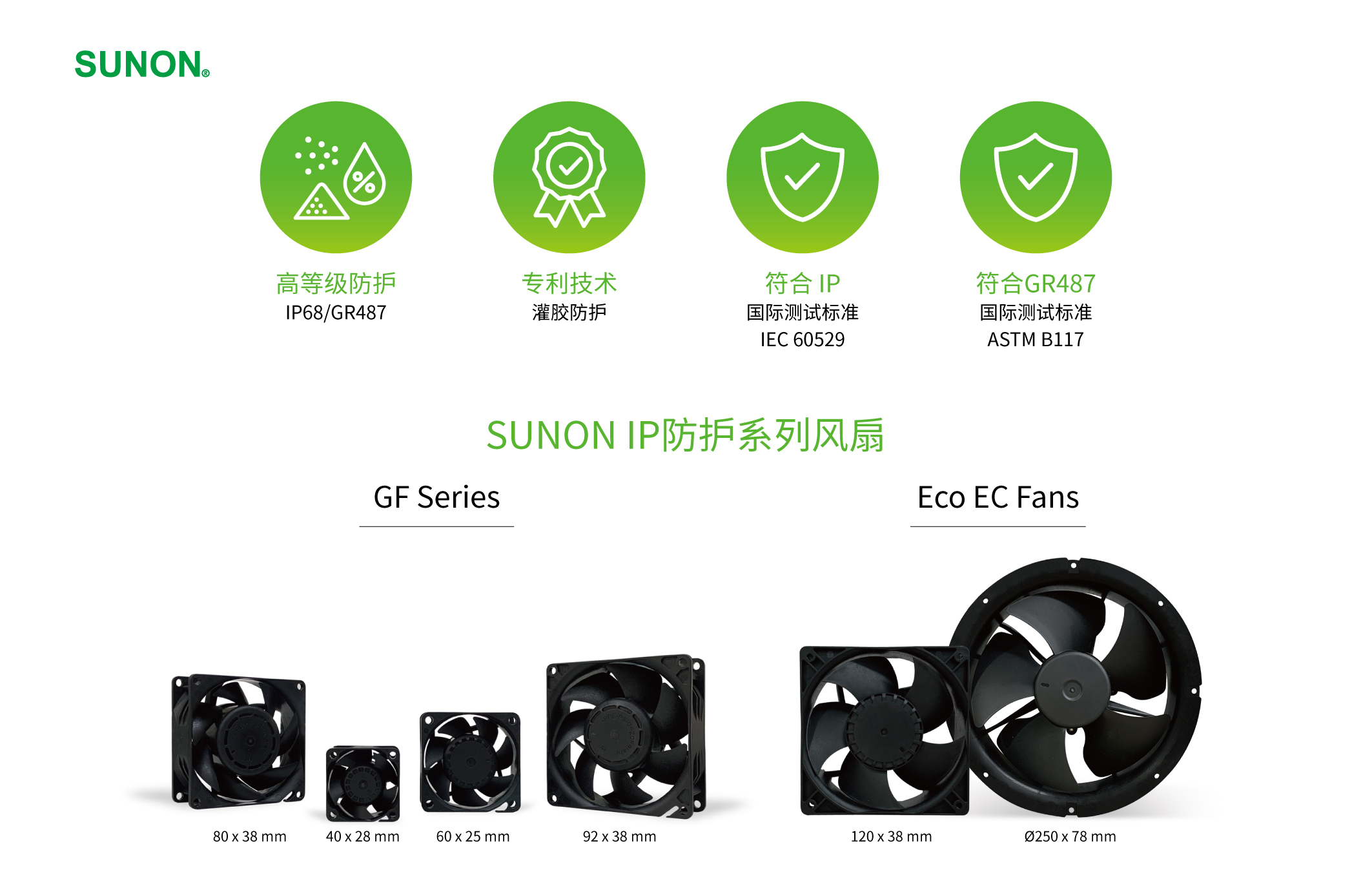 面临越来越剧烈的全球环境变化,SUNON创新开发「最高防尘防水IP 68风扇&耐盐雾GR487风扇」: GF系列目前已推出3个尺寸:40x40x28、60x60x25、92x92x38 mm,还有即将上市的80x80x38mm耐盐雾系列,更多尺寸将陆续发行,以专利灌胶马达防护技术(中国发明专利ZL 2013 1 0481929.6/2014 1 0022982.4)完整包覆整颗马达,可有效防护马达隔绝灰尘、水、盐雾等物质,让风扇不论在沙漠、极地、高山、海边等恶劣环境下可长时间稳定运作,提供高效能的散热,展现SUNON领先业界的产品竞争力。