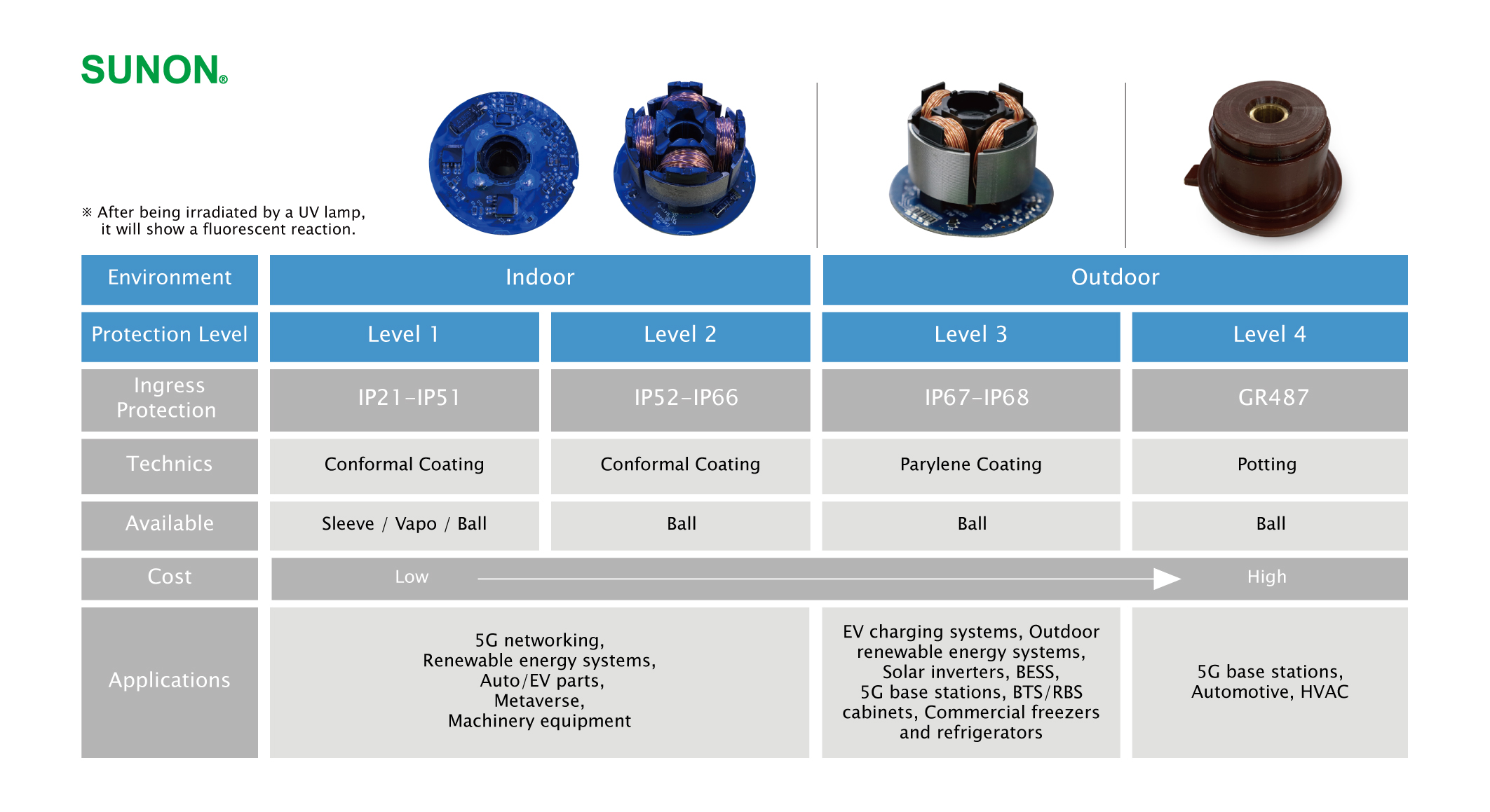 SUNON IP防护风扇依室内户外应用环境的需求推出标准Level 1-4的保护等级设计服务,采用先进IP技术和高质量防护材料,为各式应用系统规划优化IP风扇防护组合,且符合国际测试标准(防水防尘IEC60525 / 防盐雾ASTM B117),严格把关高质量的产品防护设计,确保SUNON IP风扇系列具备最佳的防水防尘耐盐雾性,除了能应用在户外应用产业上,也能被应用在其他需要面对严苛环境挑战下,和全天候不间断的长时间运作需求的设备系统,目前已成功应用在多类的产业,提供高效散热和长效使用寿命。