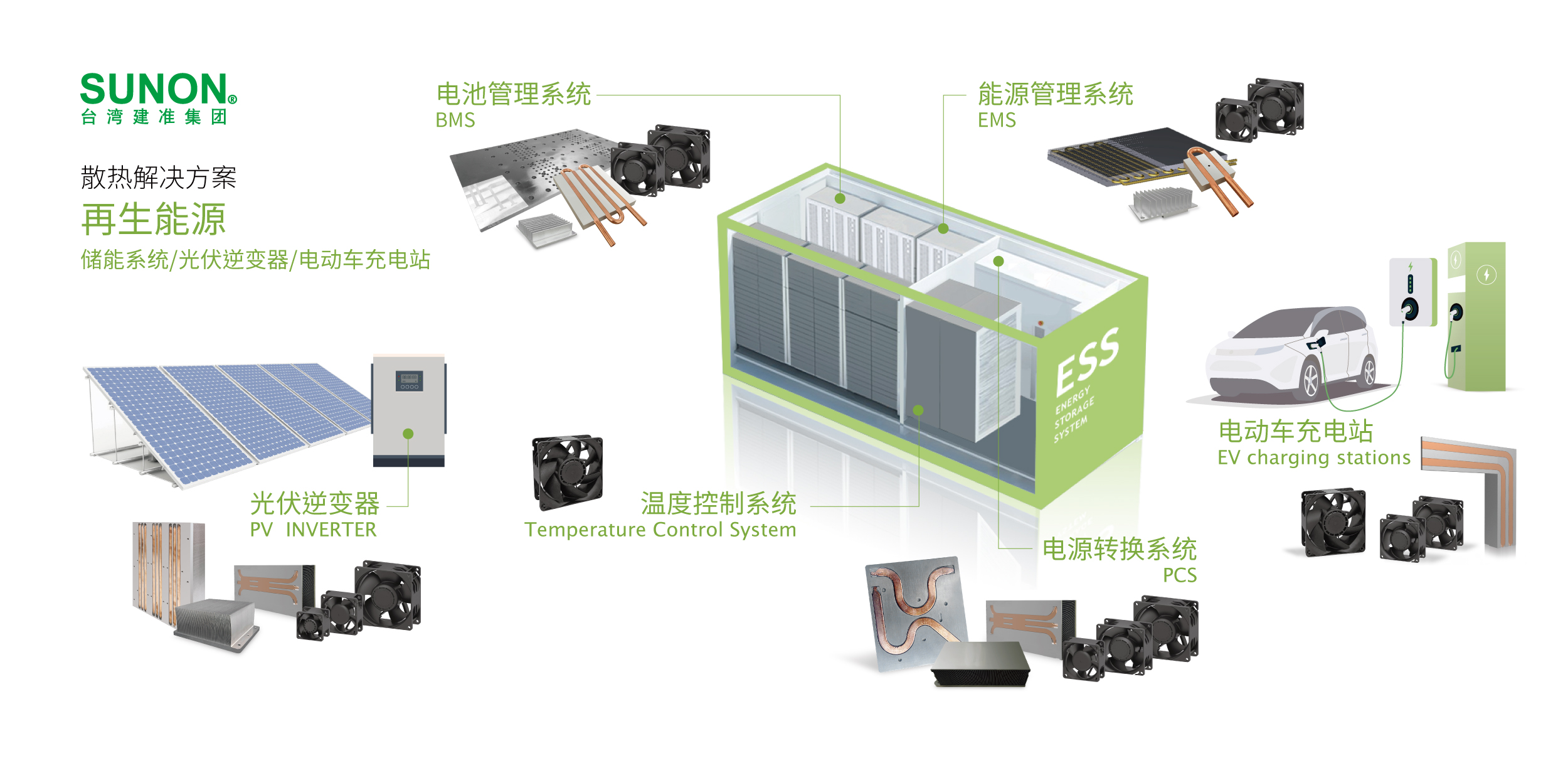 SUNON 提供完整的散热风扇与散热模组产品。高防护系列GF/PF 风扇提供高效能散热与兼具防尘防水IP68 最高等级与GR487耐盐雾等防护功能;客制化水冷模组及完整的技术评估服务,快速提供客户最适化散热解决方案,满足恶劣环境下运作的EV充电系统、ESS 储能系统、太阳能PV逆变器等再生能源系统使用。